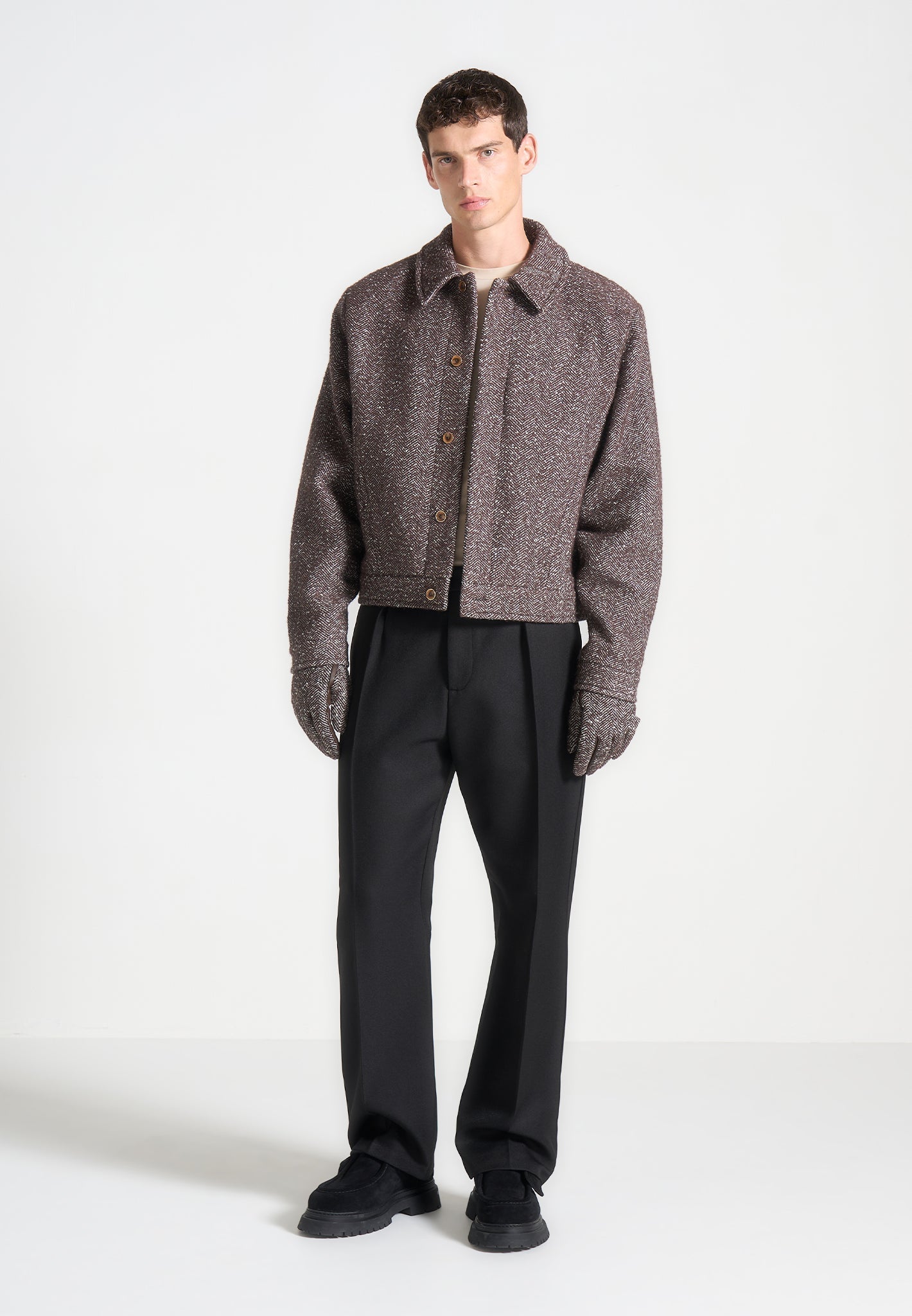 Leather and Herringbone Gloves - Brown